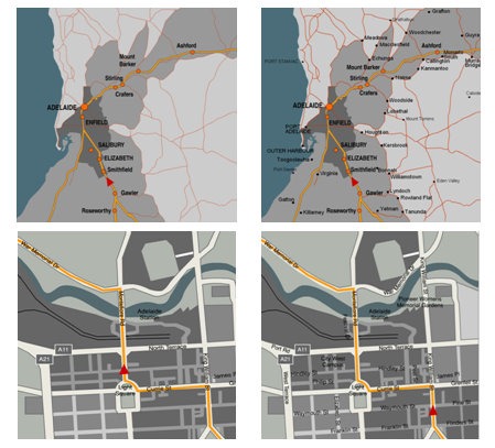 Figure 1. Examples of maps in a ‘Traditional elegant monochromatic’ graphic style, with more (right maps) and less (left maps) information for the rural (upper row) and urban (bottom row) settings.