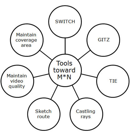Tools: Tools can be divided into two categories: 1) tools that facilitate ‘quick setup’, i.e., aimed to ease the way of the operator into a new mission or area of operation; and 2) tools that facilitate on-going missions where acquiring new UAVs, delegating, or switching is necessary to complete the tasks at hand. The Israeli team focused primarily on tools of the second type. Some “successful” tools have been the Castling rays (see CHI paper for detail), the TIE/coupling tool, and the Maintain coverage area.