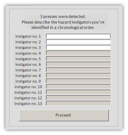 Participants first observe a movie press a button each time they perceive a hazardous situation. Once, completed a text box appears and they have to specify the reason for their presses.